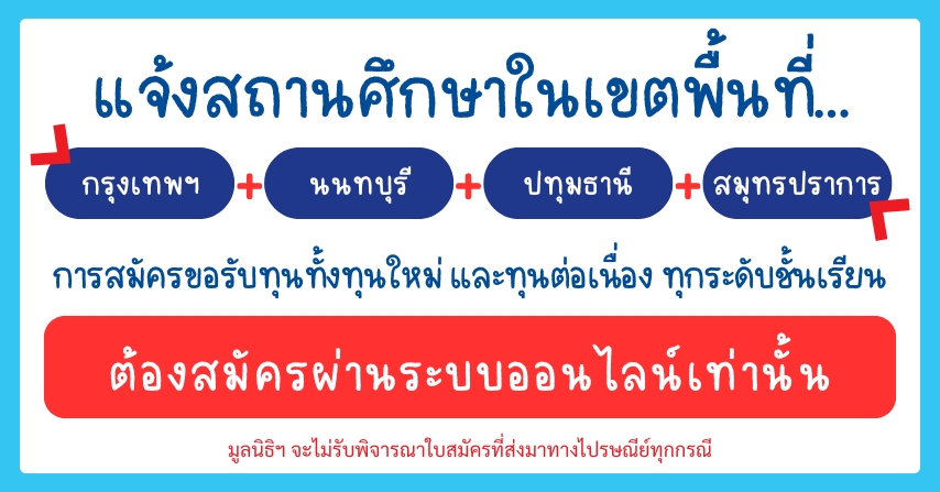 **ผู้ขอรับทุนต้องส่งสมัครขอทุนทุกปีและปฏิบัติตามระเบียบของมูลนิธิ จึงจะได้รับทุนต่อเนื่องในปีต่อไป