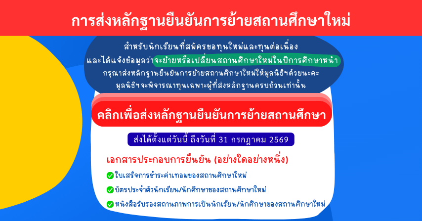 **ผู้ขอรับทุนต้องส่งสมัครขอทุนทุกปีและปฏิบัติตามระเบียบของมูลนิธิ จึงจะได้รับทุนต่อเนื่องในปีต่อไป